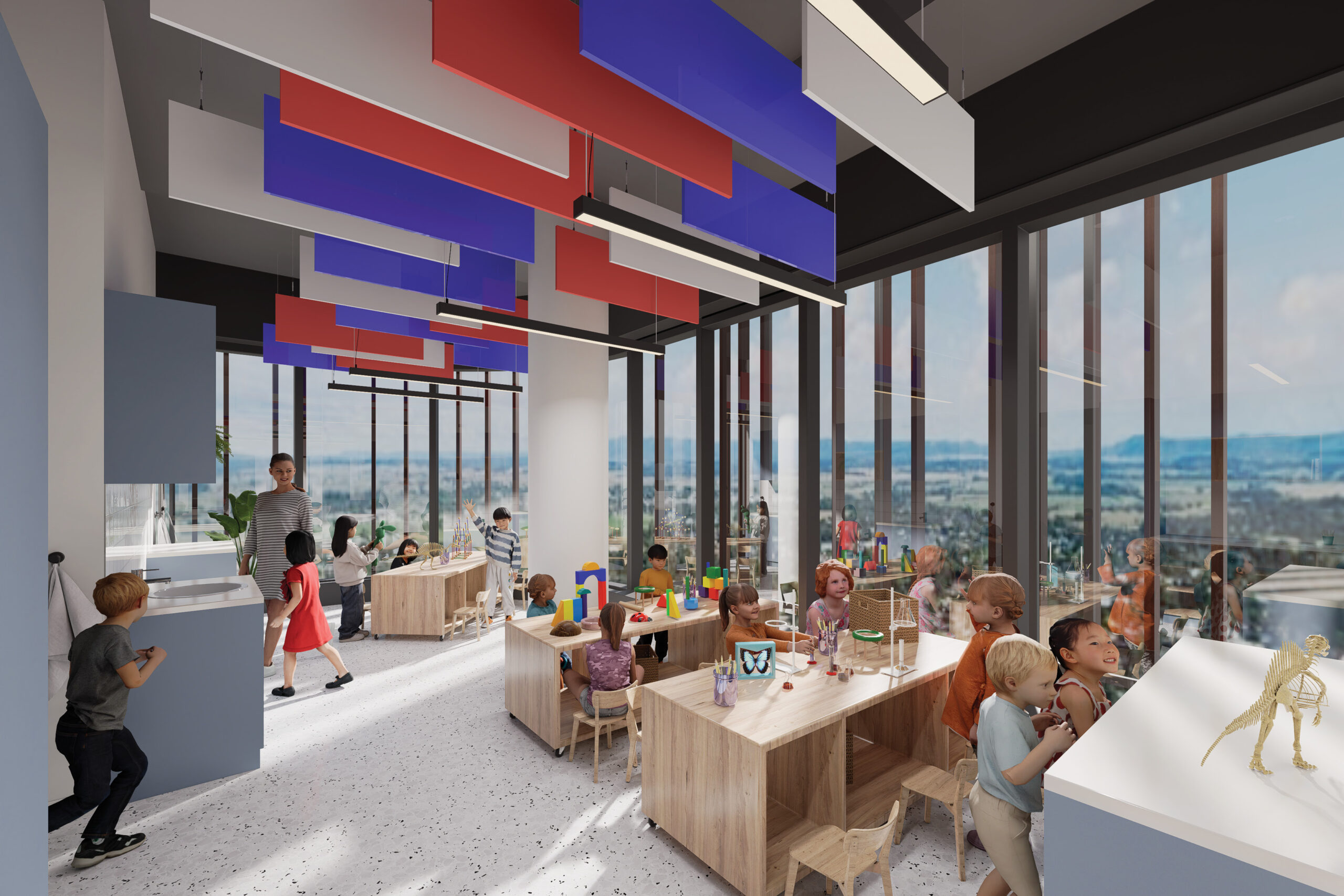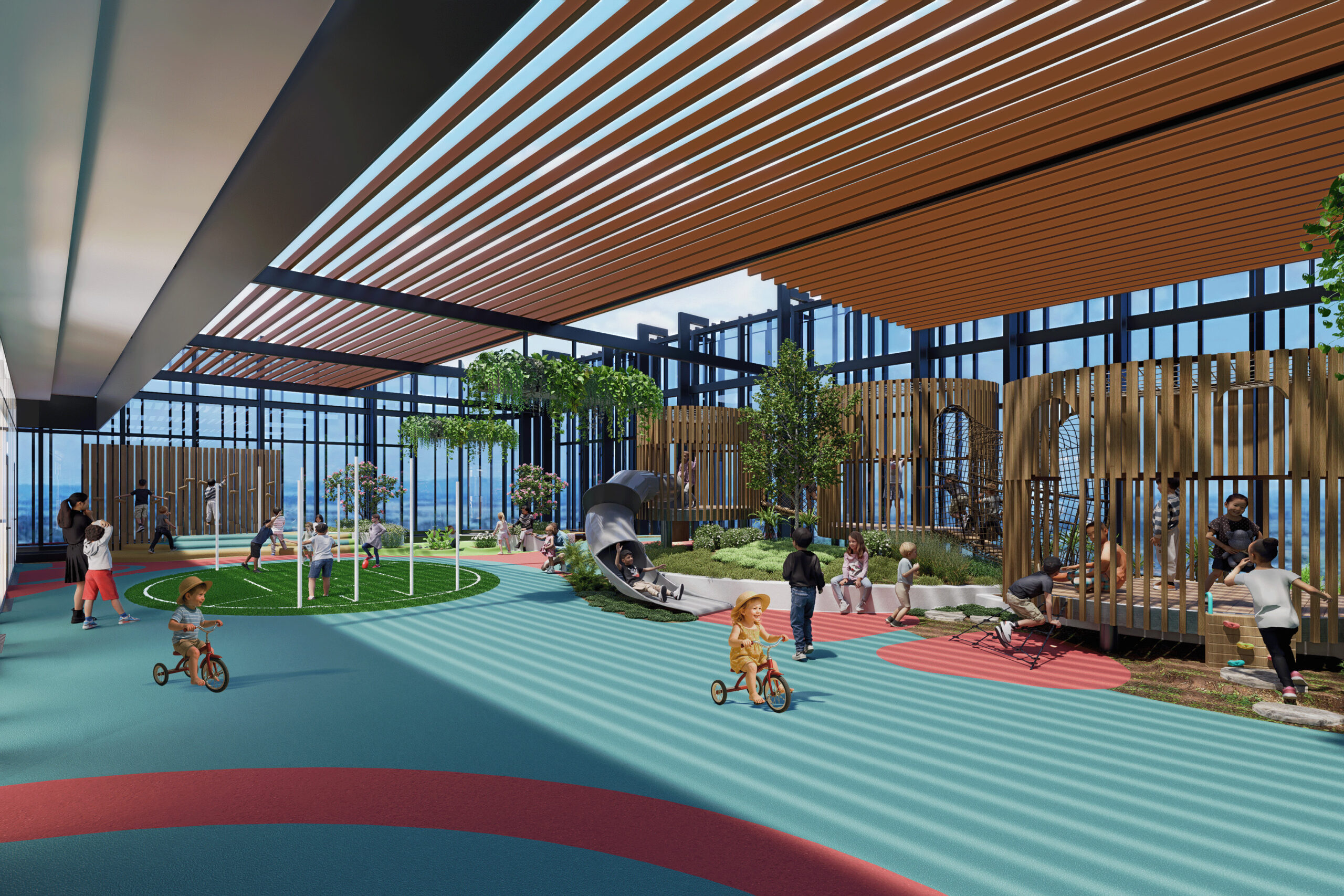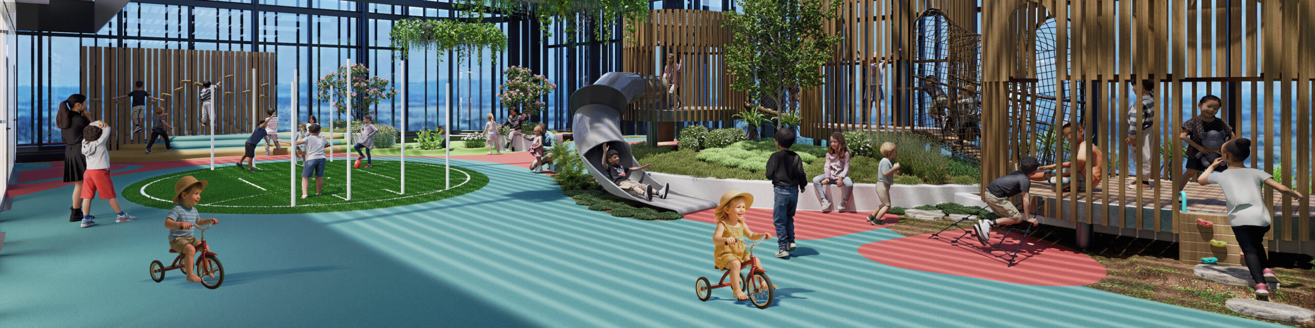 All play and learning elements are embedded within a nature-inspired setting — surrounded by mature trees, elevated and hanging greenery, water features, and birdhouses. These elements not only enhance the sense of immersion but also offer natural shade and a meaningful connection to the outdoor environment.