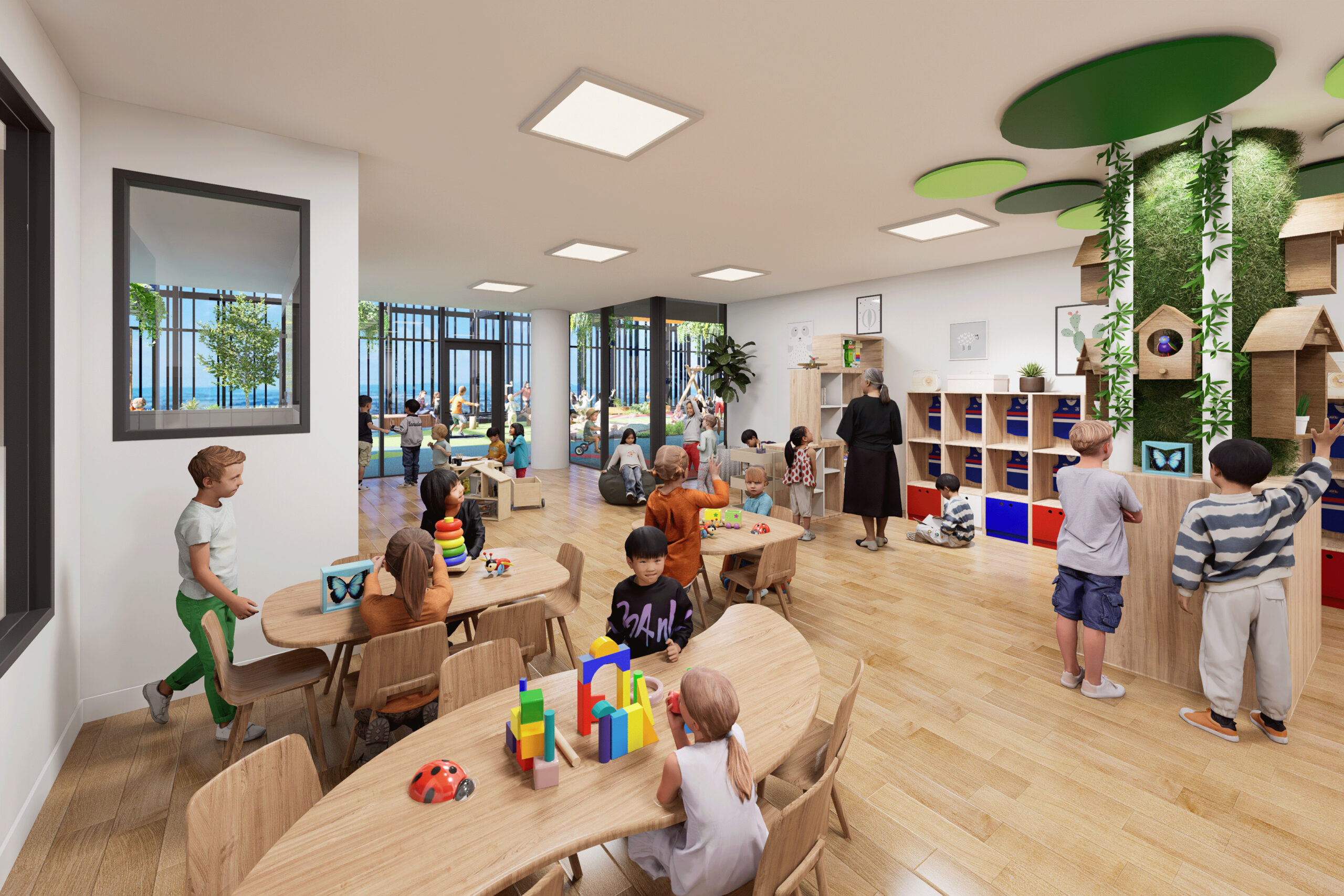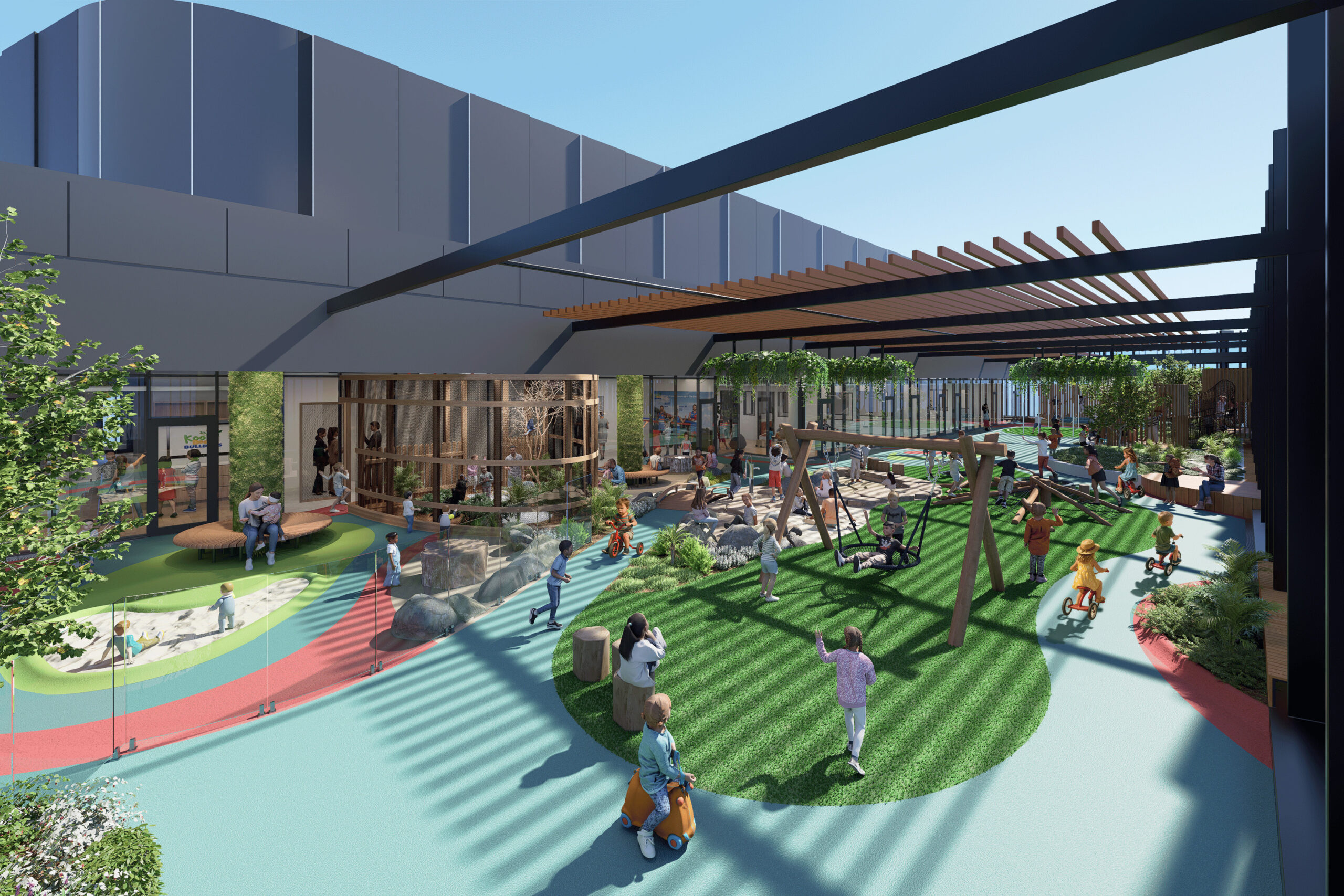 Our team worked closely with the client to design a bespoke playground tailored to infants, junior, and senior kindy children. The custom play features include a monkey wall, a triple play tower nestled within raised planters, nature-based play obstacles, and water play elements such as a rowing station, rock creek, Zen water feature, sandpit, and swings.
