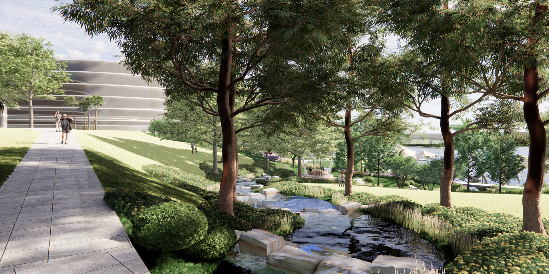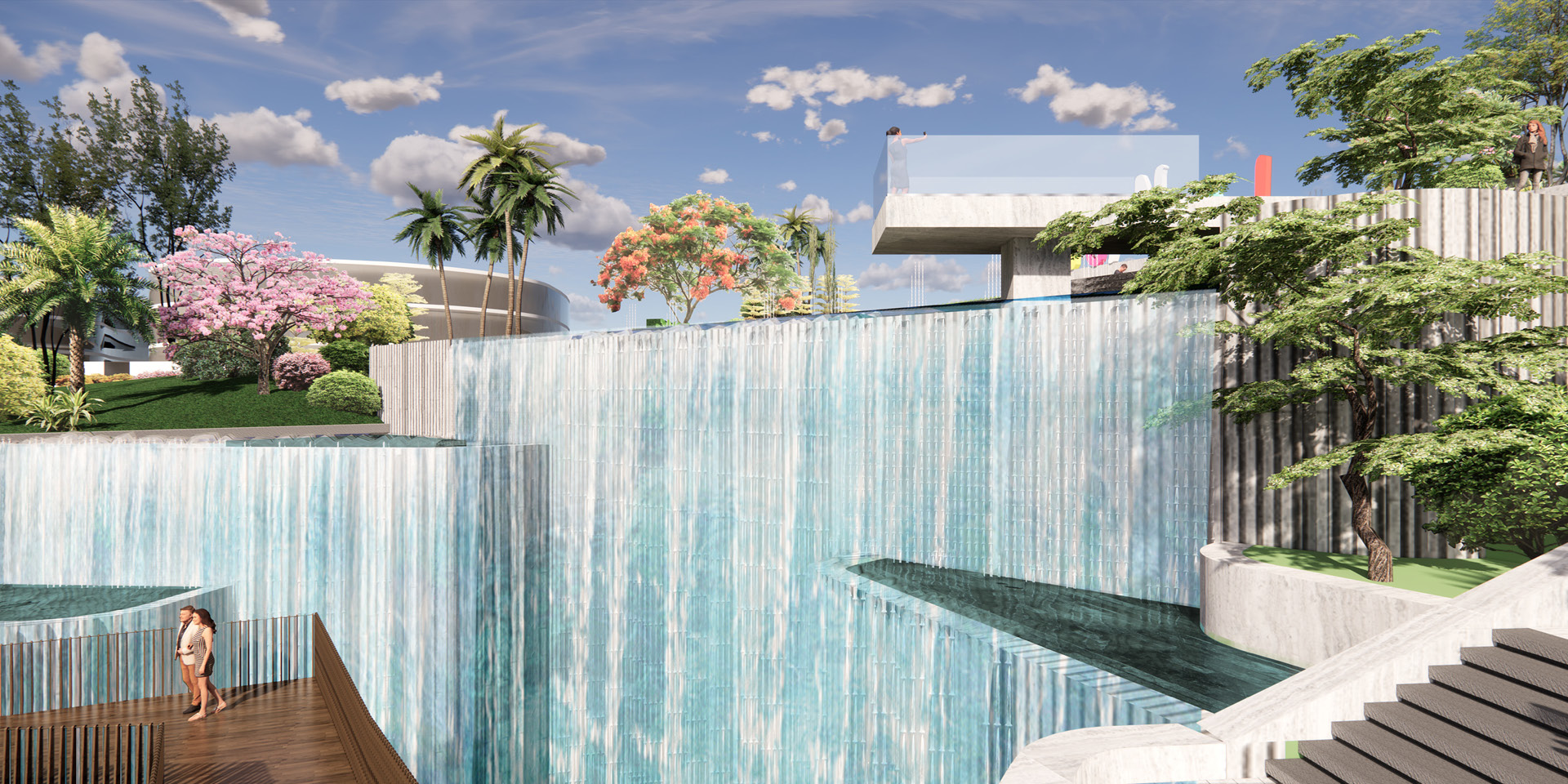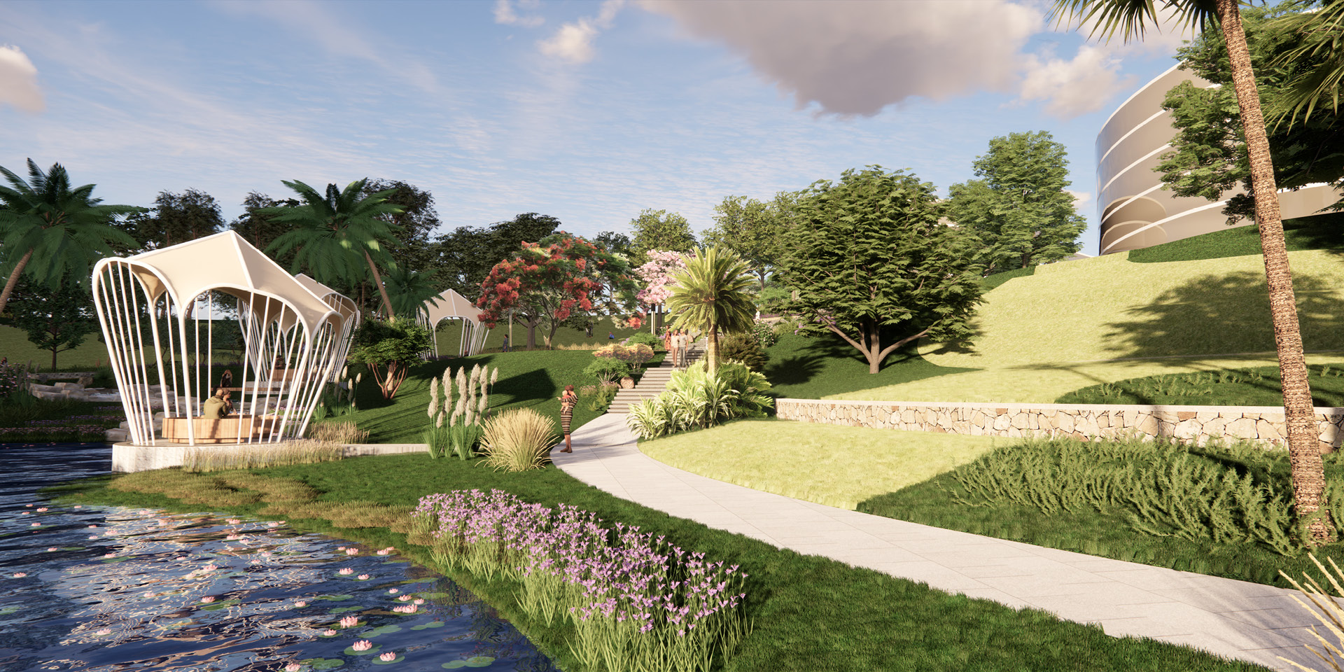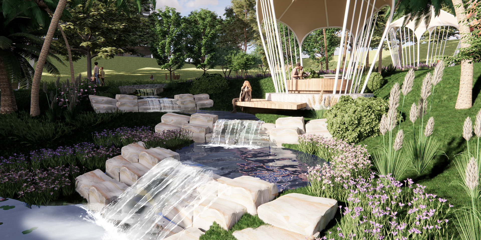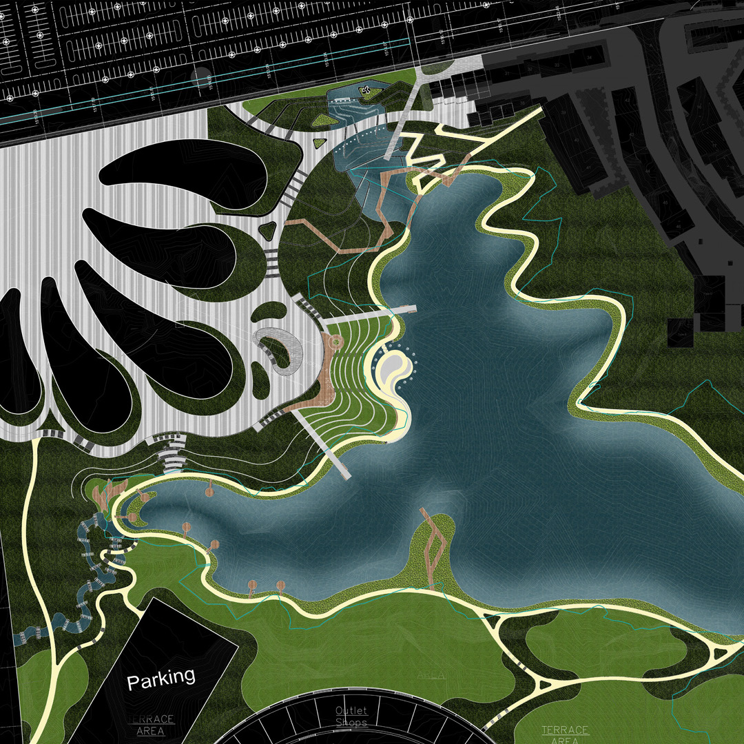 This project transforms the inner lake green space nestled between the main road, the art center, and the commercial hub into a vibrant and dynamic environment. At the heart of this design is a grand open-air amphitheater, ingeniously utilizing a cascading waterfall to address elevation changes while creating a stunning visual centerpiece. This amphitheater not only serves as a focal point but also as a versatile space for community gatherings and cultural events.