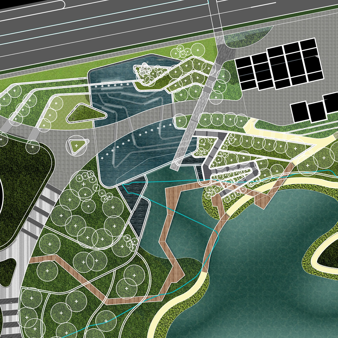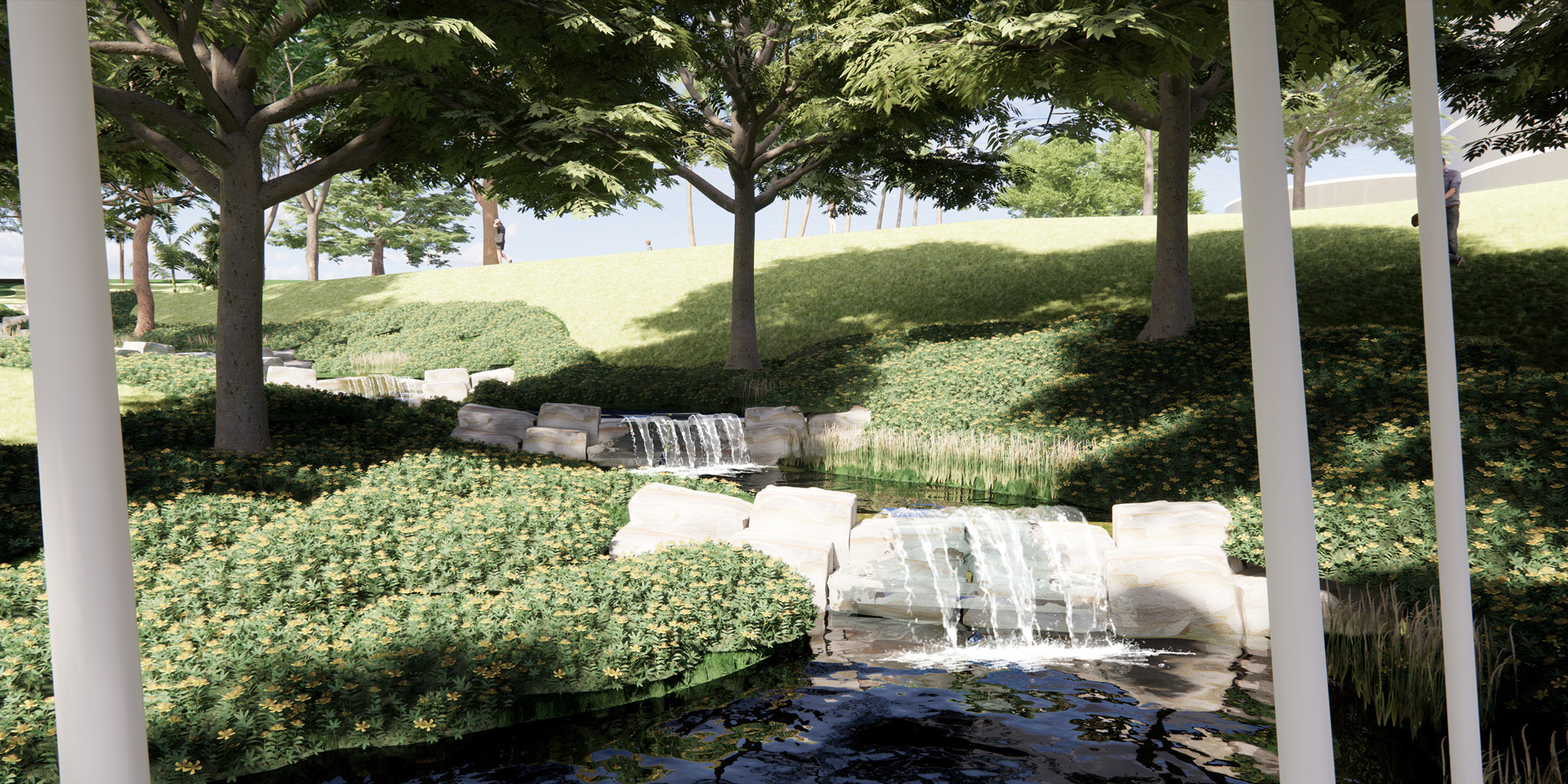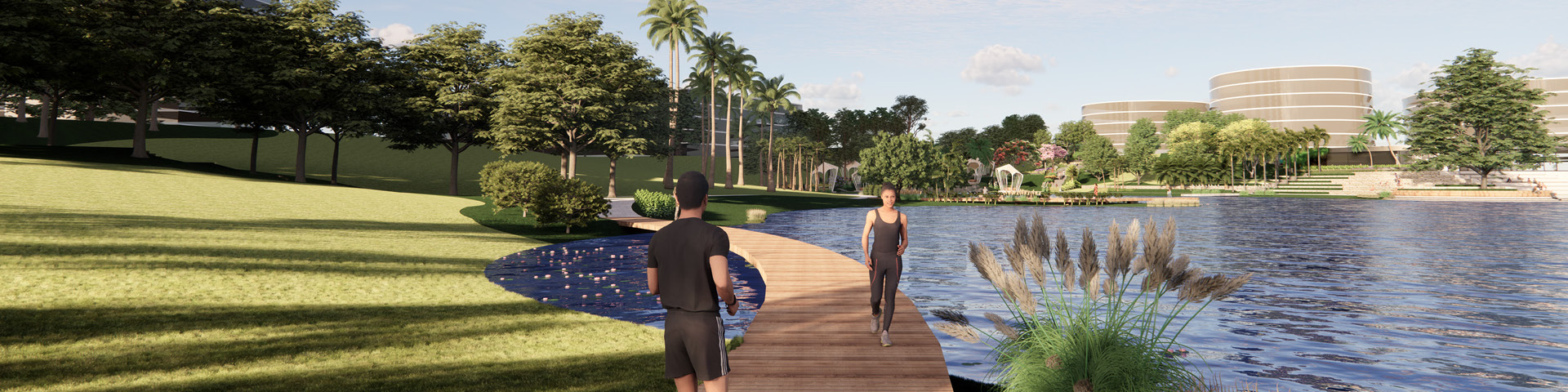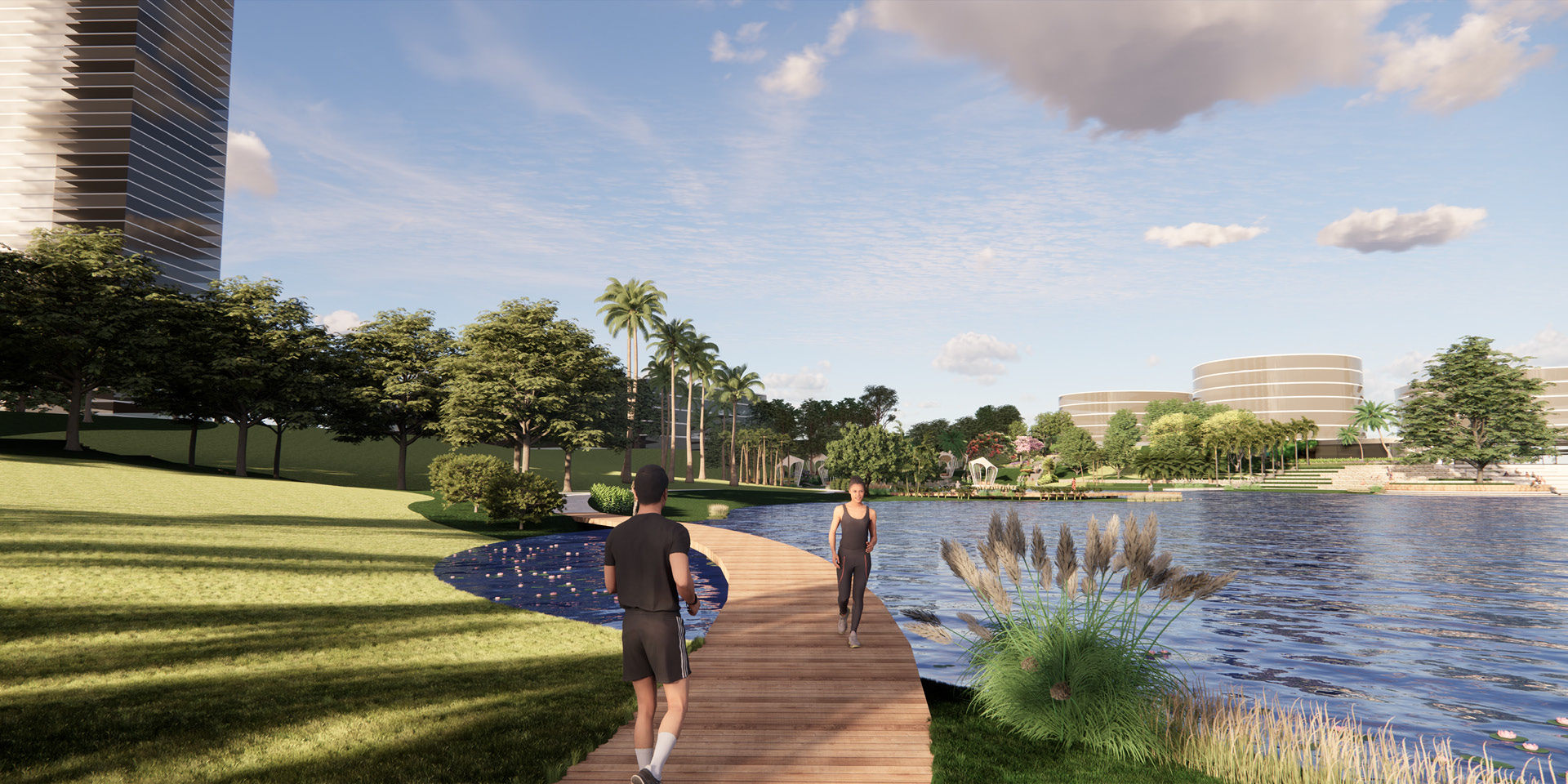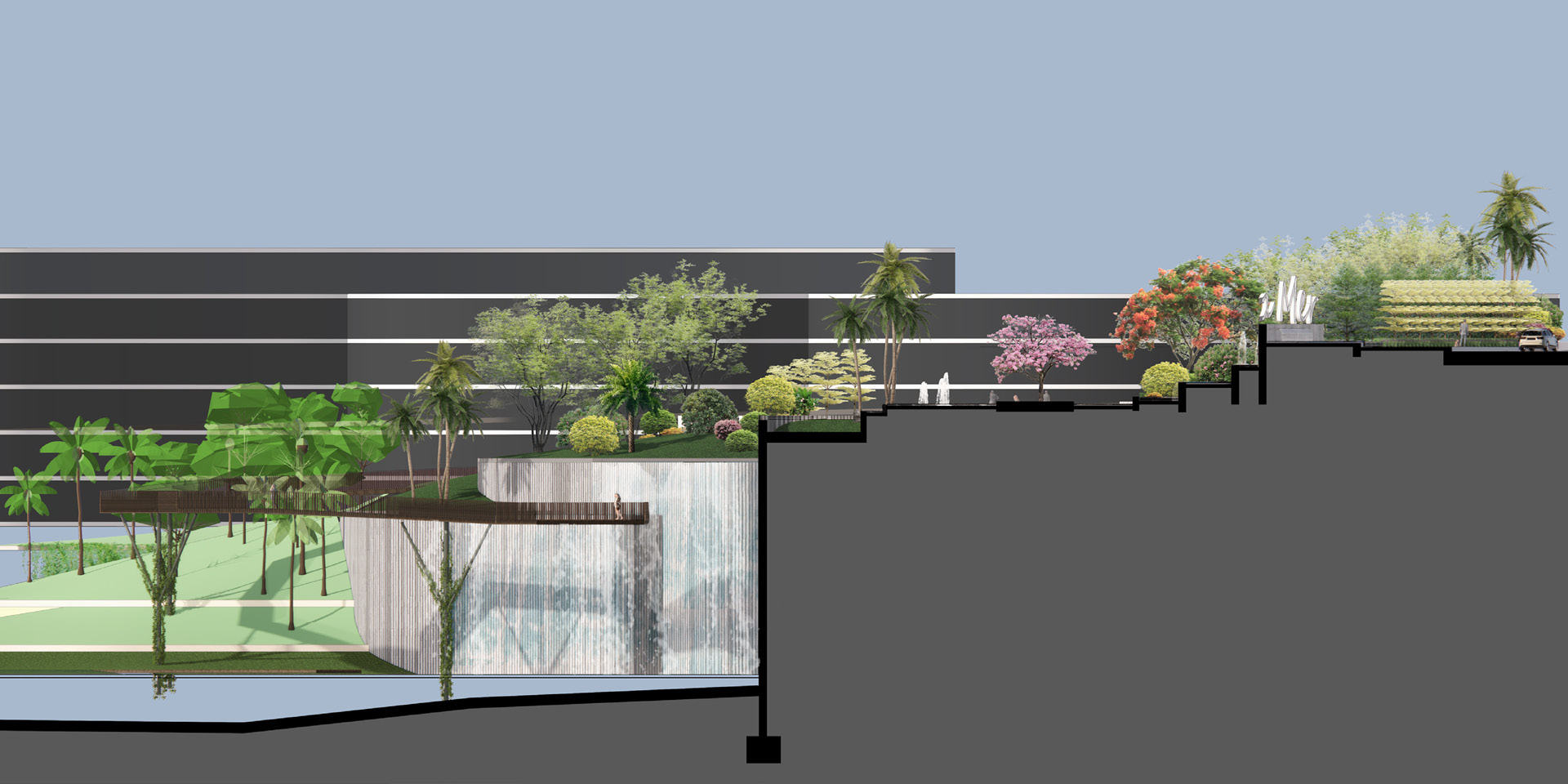 This project transforms the inner lake green space nestled between the main road, the art center, and the commercial hub into a vibrant and dynamic environment. At the heart of this design is a grand open-air amphitheater, ingeniously utilizing a cascading waterfall to address elevation changes while creating a stunning visual centerpiece. This amphitheater not only serves as a focal point but also as a versatile space for community gatherings and cultural events.